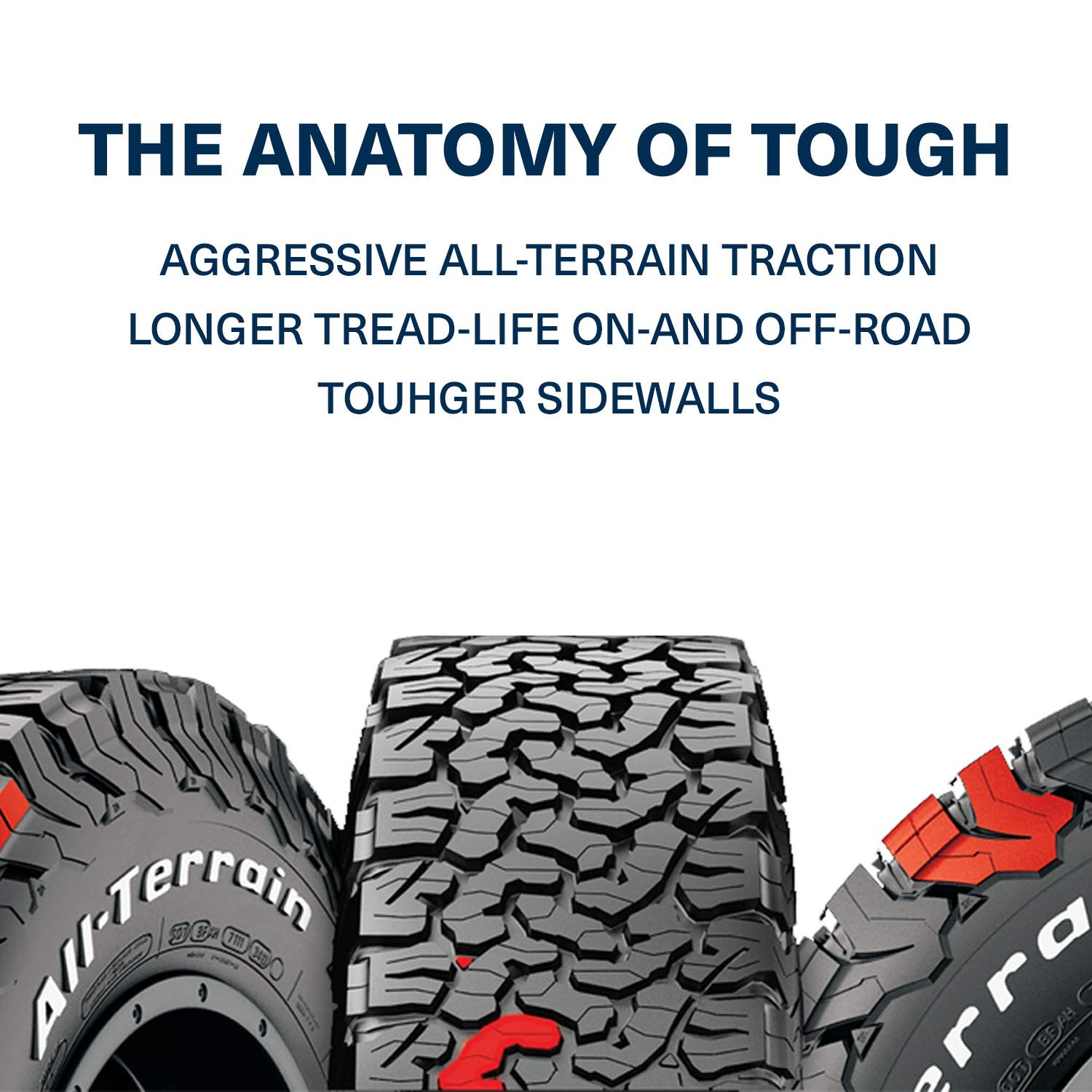 - TOUGHNESS MEETS COMFORT: BFGoodrich All-Terrain T/A KO2 radial car tires offer durability, control and comfort on and off the road: in mud, dirt, snow, sand and rocks