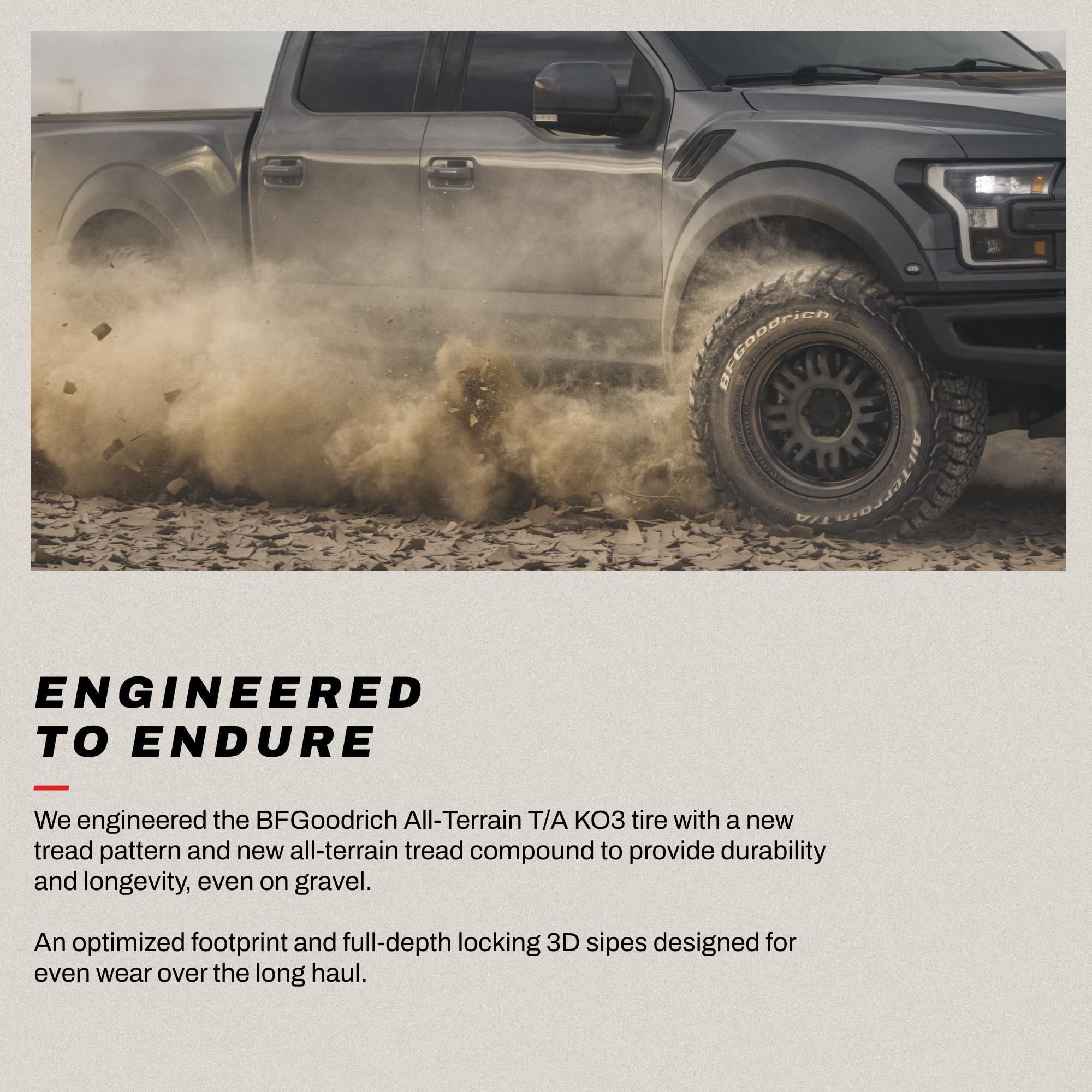 - ENGINEERED TO ENDURE: We engineered the BFGoodrich All-Terrain T/A KO3 tire with a new tread pattern and new all-terrain tread compound to provide durability and longevity, even on gravel.